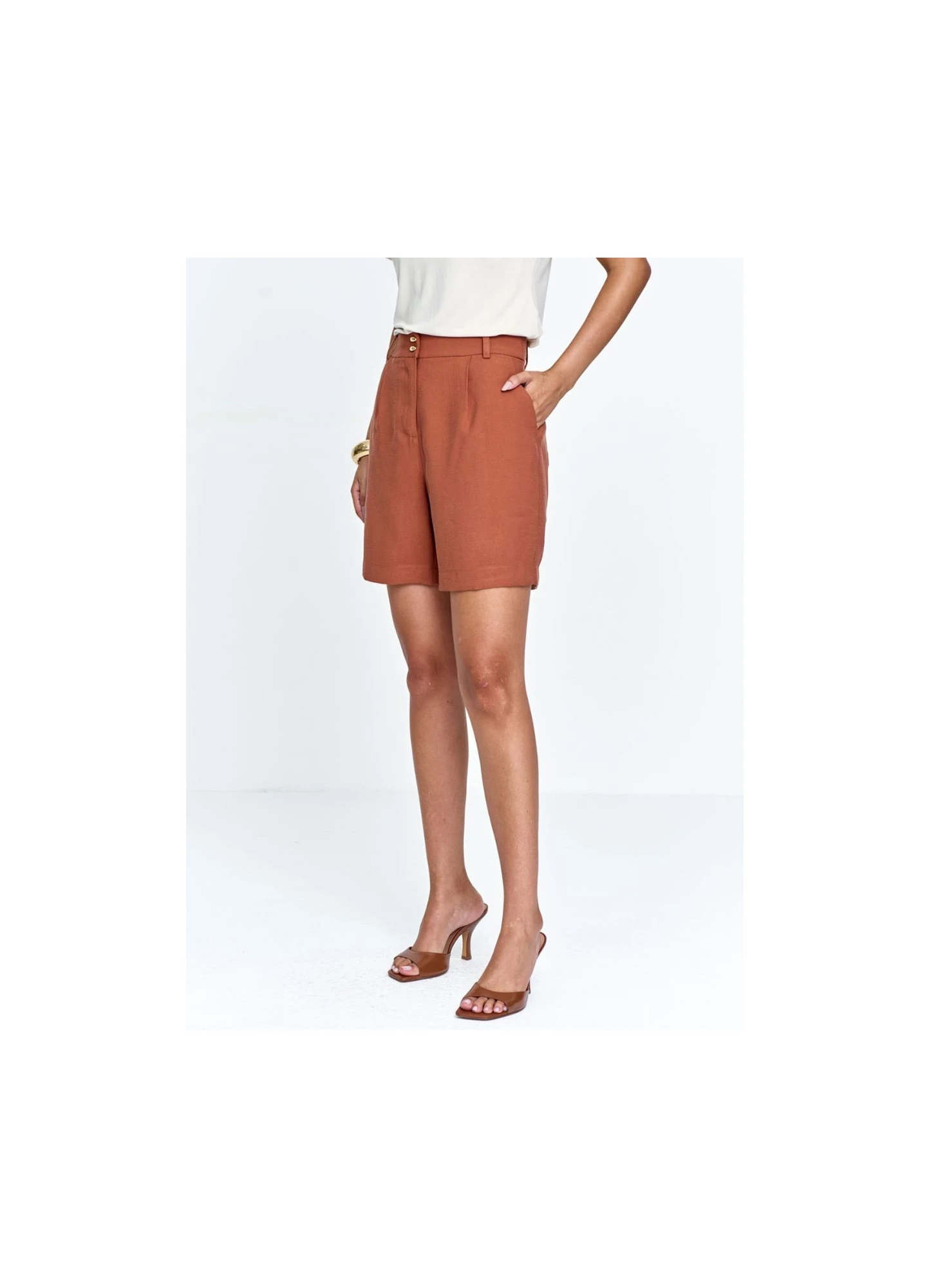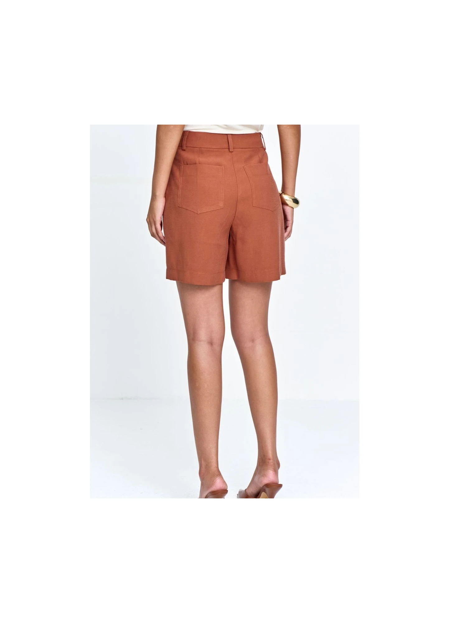 SHORTS ALFAIATARIA, BOLSOS FUNICIONAIS, CINTURA ALTA, FECHAMENTO COM BOTÕES DUPLOS, MODELAGEM RETA.