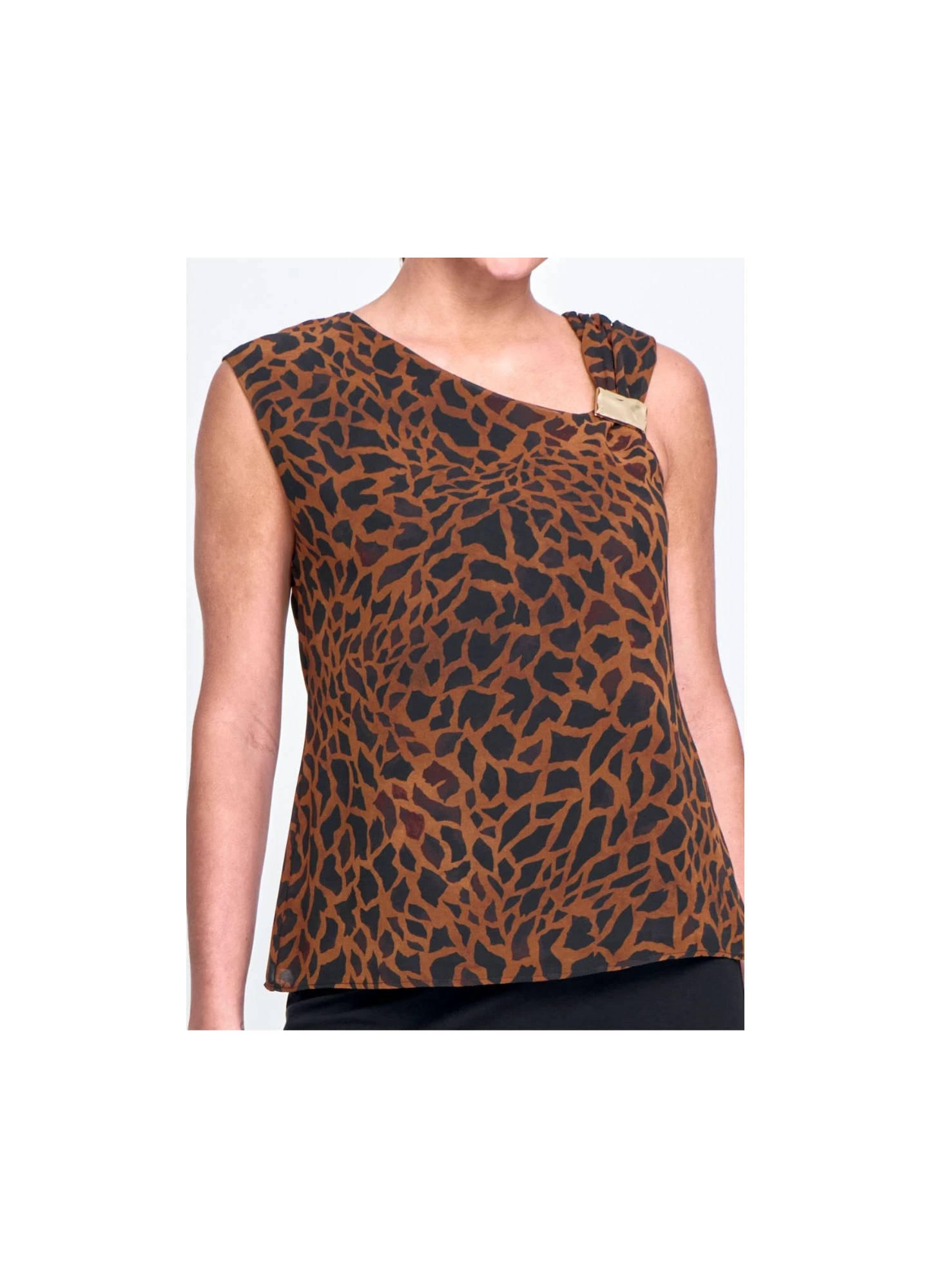 BLUSA CHIFFON ANIMAL PRINT, LEVE TRANSPARÊNCIA, COM FORRO, PASSANTE METÁLICO NA ALÇA, DECOTE ASSIMÉTRICO, MODELAGEM SOLTA E FLUIDA.