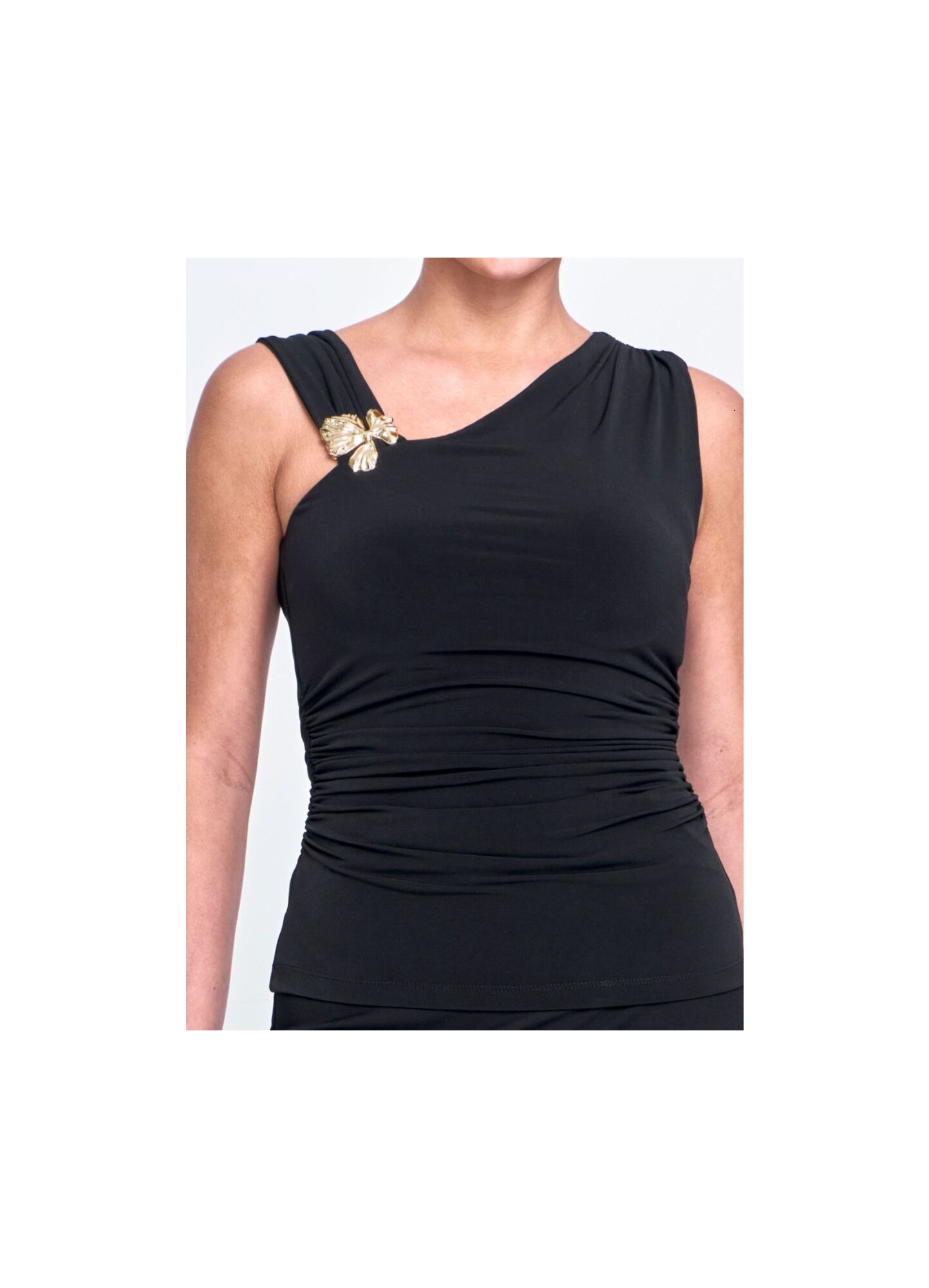 BLUSA MALHA, COM DECOTE ASSIMÉTRICO, ALÇA FRANZIDA, AVIAMENTO NA ALÇA, MODELAGEM RETA.