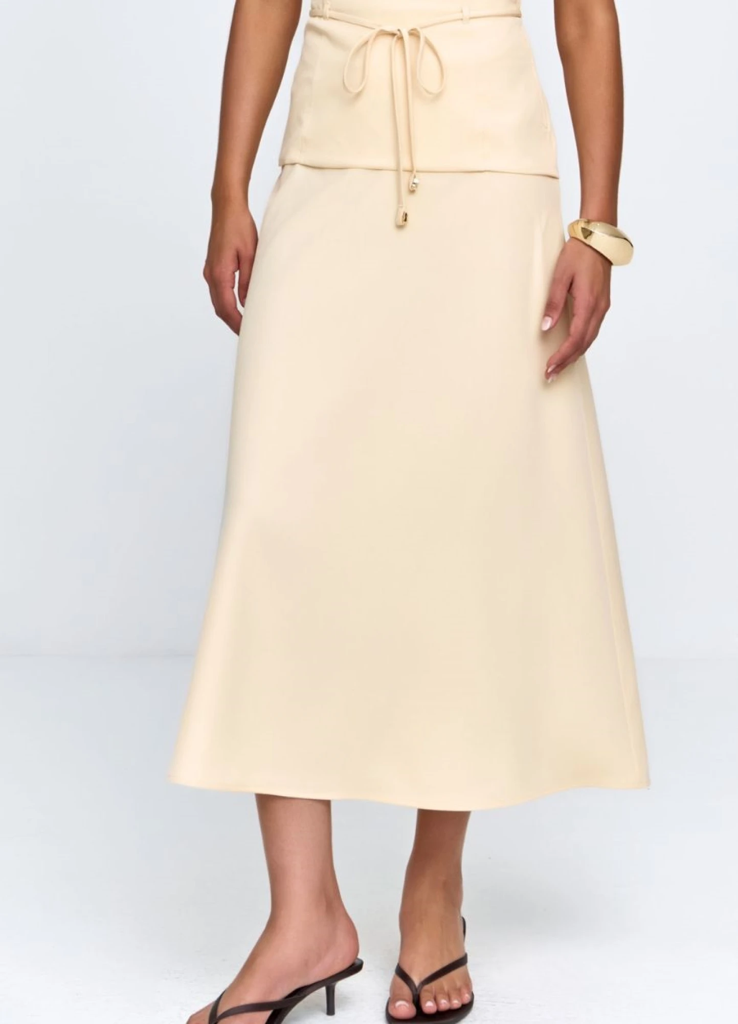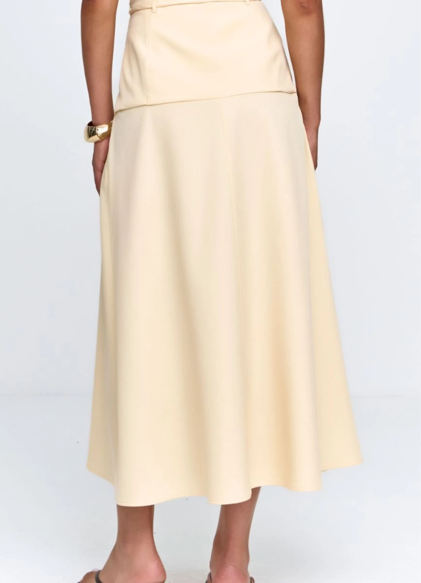 SAIA ALFAIATARIA MIDI, COM PASSANTE E CINTO FORRADO, MODELAGEM AJUSTADA E BEM FLUIDA.