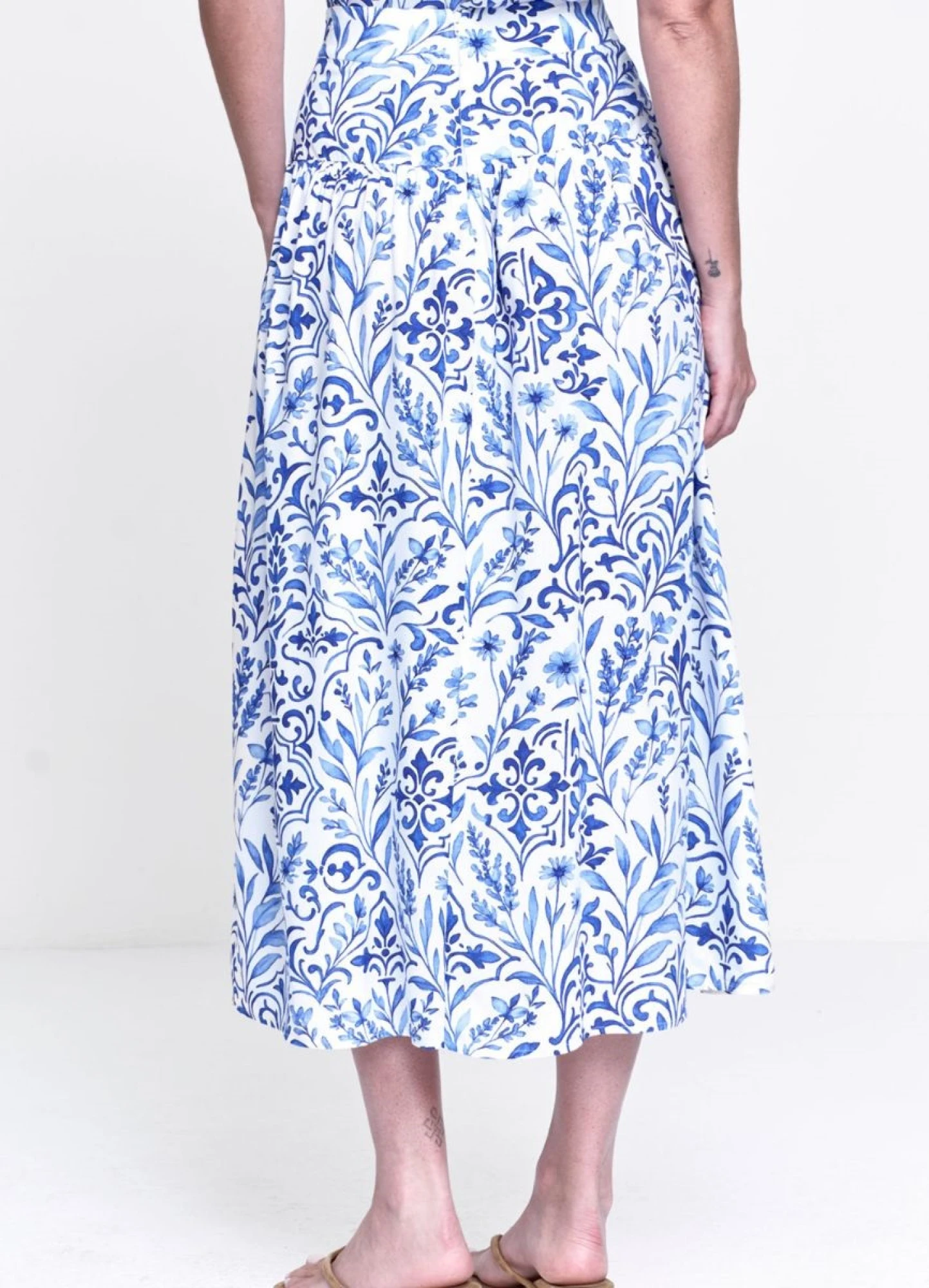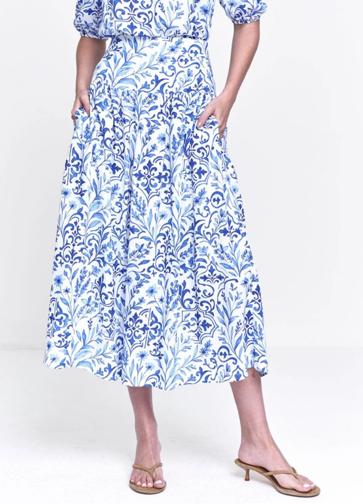 SAIA VISCOSE ESTAMAPADA MIDI, COM PALA VALORIZANDO A CINTURA, BOLSOS, TECIDO LEVE E FLUIDO, MODELAGEM RETA.