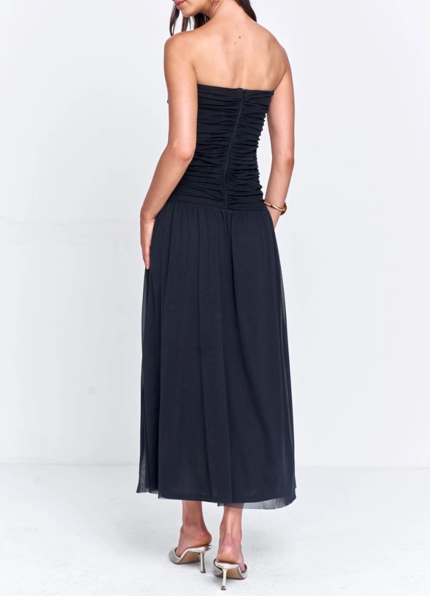 VESTIDO TULê MIDI, TOMARA QUE CAIA, COM FRANZIDO PARA UM AJUSTE CONFORTÁVEL, ÓTIMO CAIMENTO, BEM FLUIDO.