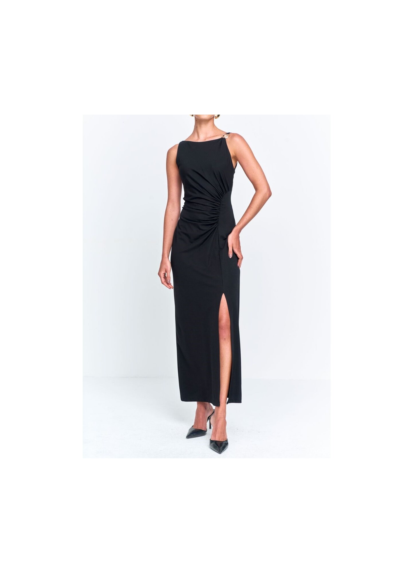VESTIDO LONGO MALHA, COM FENDA E FRANZIDO NA LATERAL, DETALHE DRAPEADO, SEM MANGAS, DETALHE PASSANTE NO ACABAMENTO SUPERIOR, MODELAGEM RETA.