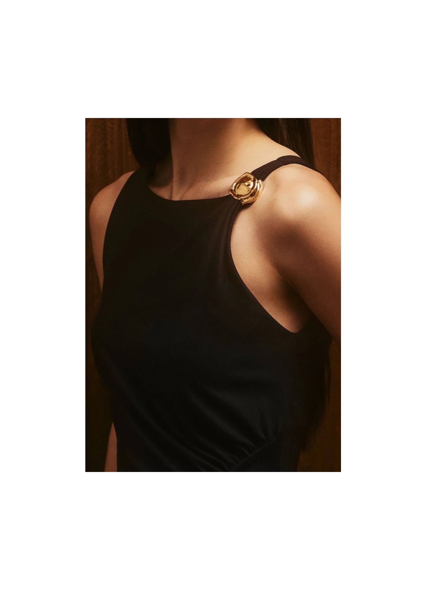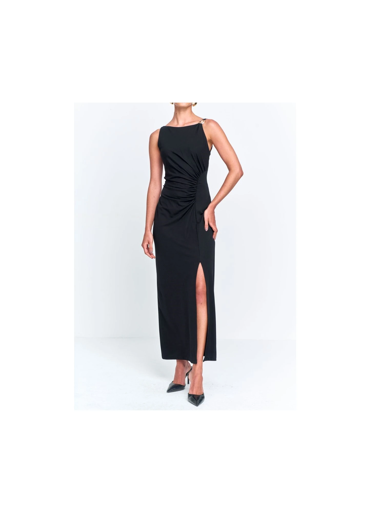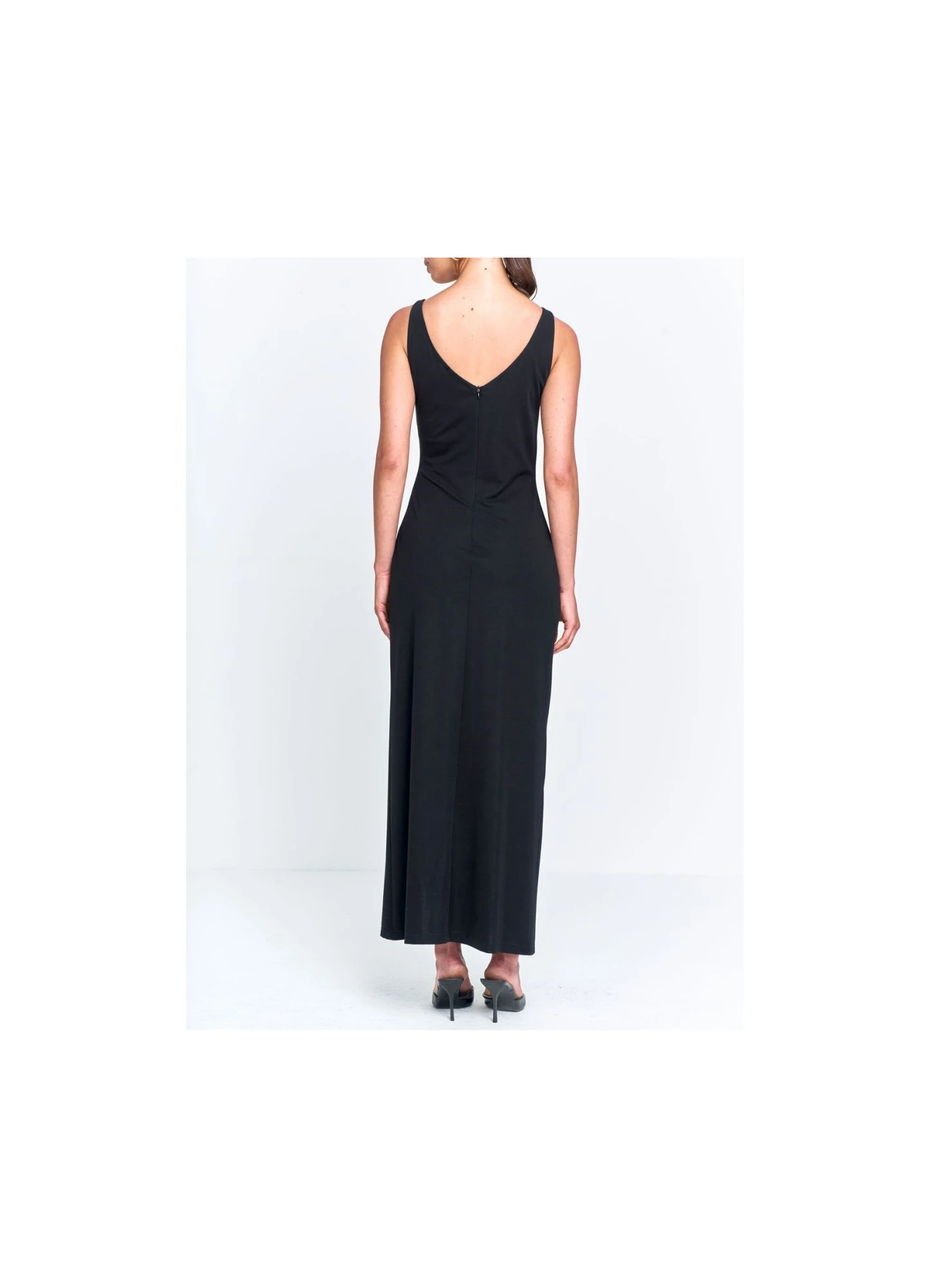 VESTIDO LONGO MALHA, COM FENDA E FRANZIDO NA LATERAL, DETALHE DRAPEADO, SEM MANGAS, DETALHE PASSANTE NO ACABAMENTO SUPERIOR, MODELAGEM RETA.